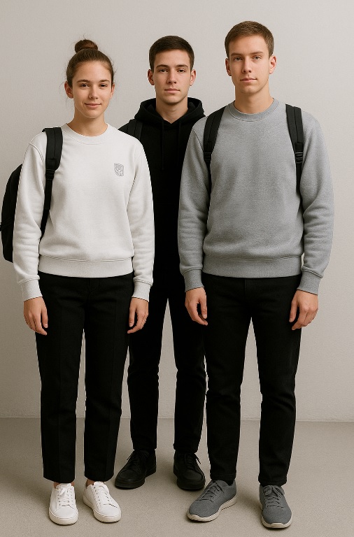 Okulumuz öğrenci kıyafeti tek tip kıyafet olup görselde belirtildiği gibi üstte beyaz yakalı tişört ve güz dönemi beyaz/siyah/gri sweatshirt altta siyah pantolon şeklindedir. Herhangi bir marka veya kaliteye bağlı kalmayıp görsele uygun olacak şekilde her yerden temin edilebilir. Ayrıca atelye çalışmalarında giyilmek üzere okulumuz tarafından iş yeleği verilecektir.
